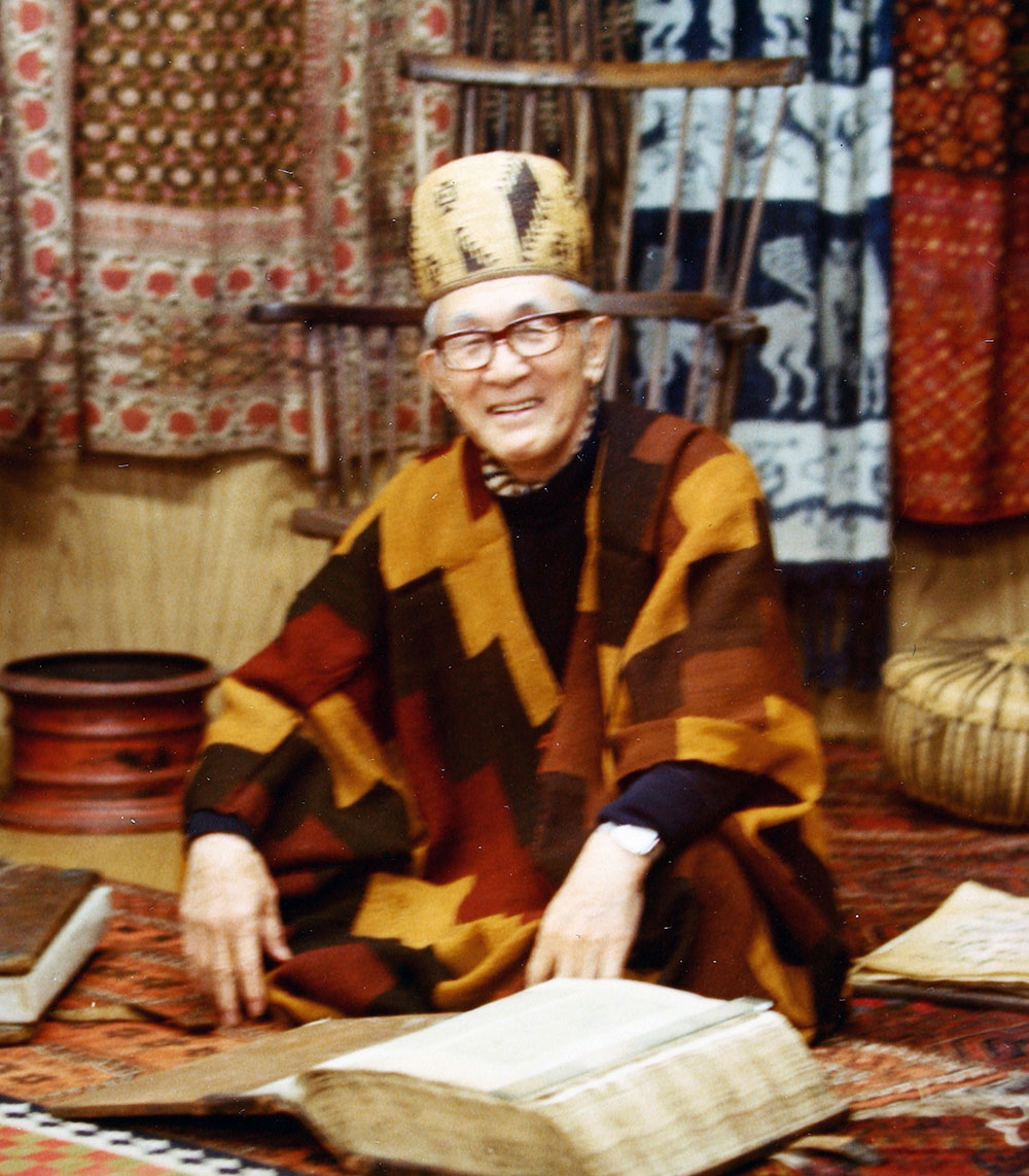 ![]() ペルーの貫頭衣を着た芹沢銈介 (1974年11月 岡山天満屋「芹沢銈介の五十年 作品と身辺の品々」展会場にて) |